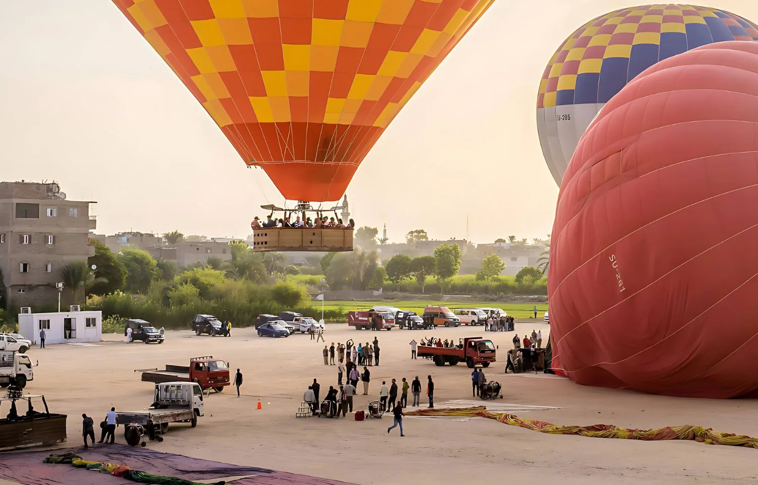 Once on the West Bank, you'll be transported to the hot air balloon takeoff area, where the excitement builds as preparations are finalized.