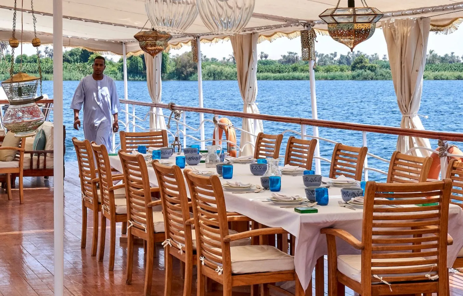 Welcome aboard the Lazuli Albatros Dahabiya Nile Cruise with a refreshing drink. Relax in elegant surroundings as the cruise begins, offering stunning views of picturesque villages and lush green landscapes along the Nile.