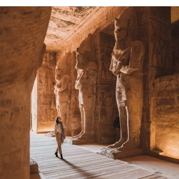 Marvel at the majestic Abu Simbel Temples, masterpieces built by Ramses the Great between 1264 and 1244 BC. The first temple, dedicated to Amun, Ra, and Ptah, reflects the king’s power and victories, most famously the Battle of Kadesh. It is also the stage for the incredible Sun Festival, which takes place twice a year on February 22nd and October 22nd, illuminating the statues inside. The second temple, equally stunning, was dedicated to Ramses II’s beloved wife, Queen Nefertari, symbolizing love and devotion carved into stone.